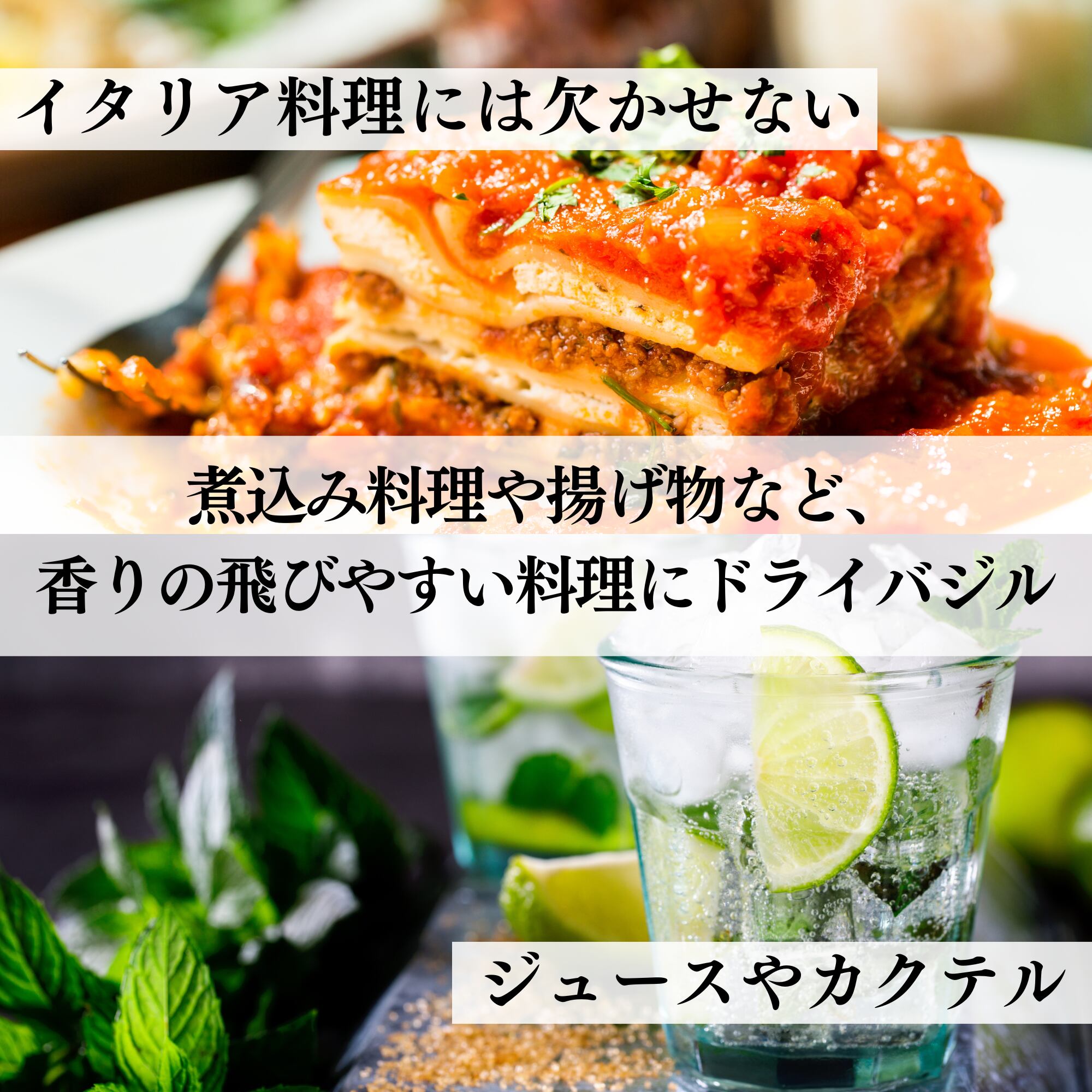 オリーブオイル、トマト、チーズなどを使ったイタリア料理との相性が抜群で、料理の風味を華やかに彩ってくれます。