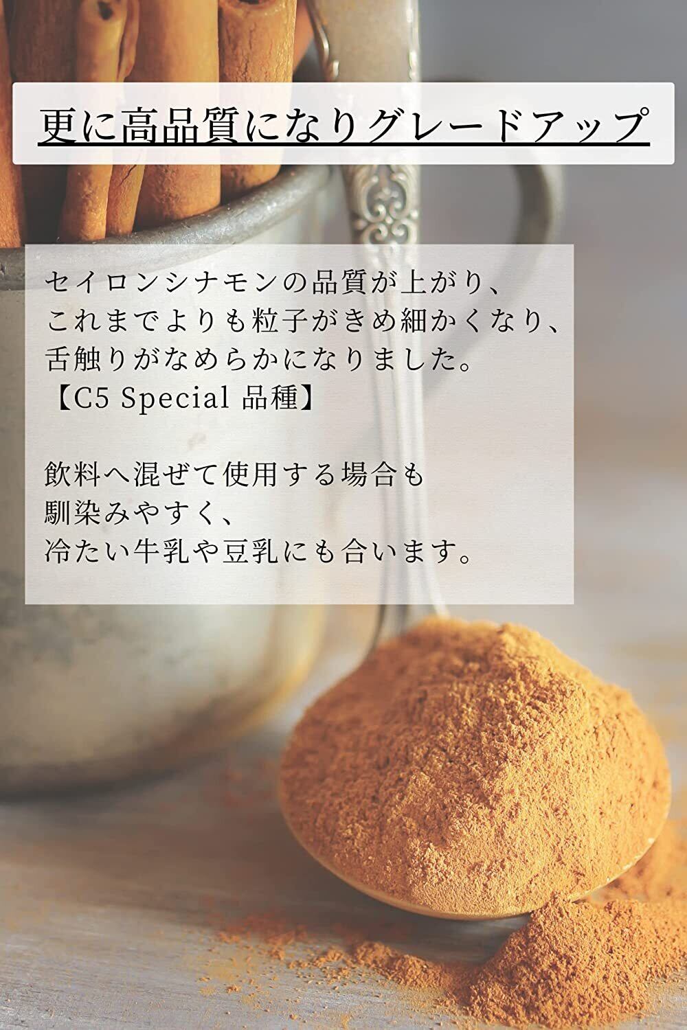 ✅【高級なC5品種】C5シナモンは細長く、心地よい香りと力強い風味が特徴です。そんなシナモンスティックを通常よりも粒子の細かい粉末にした、スリランカ政府公認の最高品質のオーガニックセイロンシナモンパウダーです。