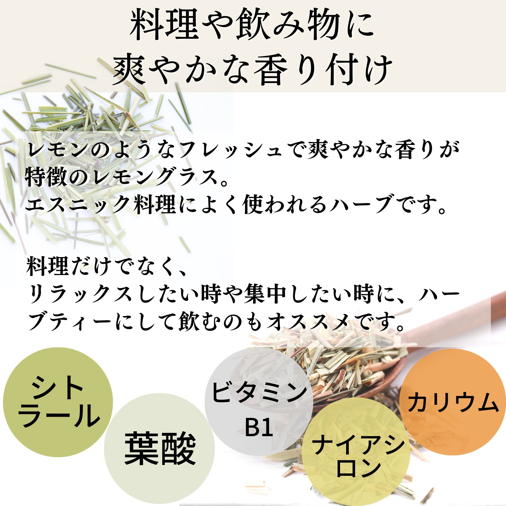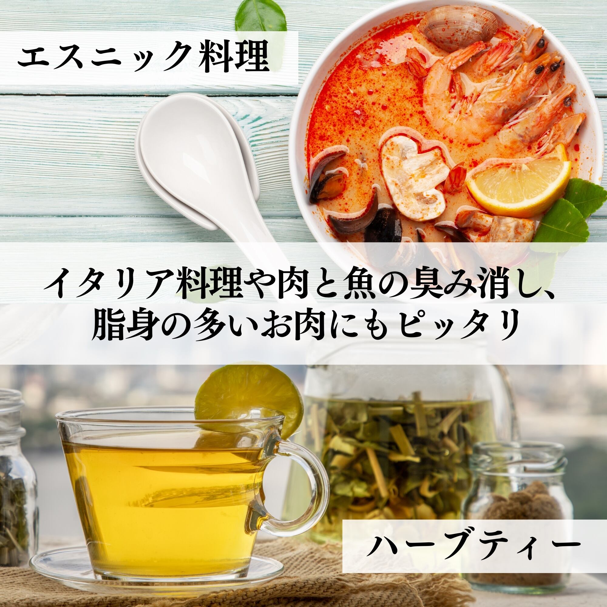 レモングラスはアジア・アフリカなど広いエリアで栽培されており、とくにタイ料理の味付けには欠かせないスパイスです。ハーブとしてはやや長いものを選んでおりますので、ハーブティーやハーブバスとしてもお楽しみいただけます。